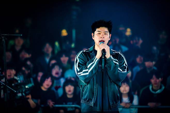 한로로는 통통 튀는 사운드의 ‘먹이사슬’로 공연 문을 열었다. 정사각형 무대를 둘러싼 네 방향 관객과 번갈아 눈을 맞추며 호흡하는 등 한층 단단해진 무대 장악력이 두드러졌다.