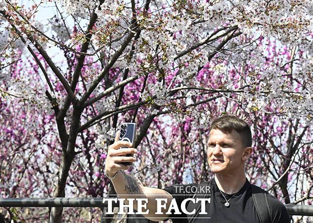 [더팩트ㅣ송호영 기자] 식목일인 5일 영등포구 여의도 봄꽃축제가 열린 윤중로에서 시민들이 사진을 찍고 있다.