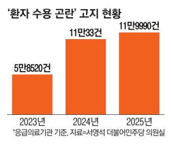 응급의료기관이 응급환자 수용을 거부하는 사례는 해마다 급증하고 있다. 서영석 더불어민주당 의원실이 국립중앙의료원에서 제출받은 자료에 따르면 응급의료기관의 '환자 수용 곤란' 고지 사례는 2023년 5만8520건에서 지난해 11만9990건으로 2배 이상 늘었다.