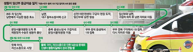 이동 과정에서도 혼선이 이어졌다. A씨가 운전하는 동안 A씨 어머니는 경북·충북 지역의 119와 통화하며 진료가 가능한 병원을 찾았다. 오전 3시 20분께 A씨와 아내는 경북 구미 선산IC에서 119구급대를 만났지만 환자 정보가 제대로 전달되지 않아 시간만 지체됐다. A씨 부부를 구급차에 태우던 구급대가 "대구로 갈 것"이라고 했기 때문이다. 구급차가 출발하기 직전 A씨는 아내를 부축해 자차로 옮겨 타고, 다시 운전대를 잡았다.