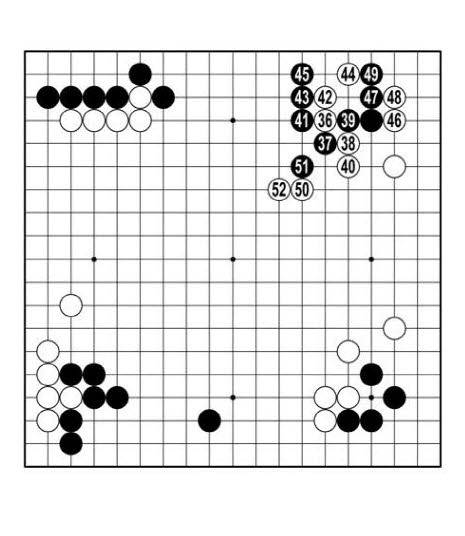 오늘 흐름에서 흑은 또 집을 늘렸다. 백도 귀 하나를 반쯤 차지하며 집을 벌었다. 백50, 52로 뻗어 오른쪽을 넓힌 것에 대면 집은 대수롭지 않을 것이다. 백38로 <참고 1도> 1에 평범하게 젖혔더라면 보지 못할 미래였다.
