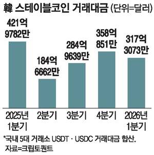 5일 크립토퀀트에 따르면 국내 5대 디지털자산거래소(업비트·빗썸·코인원·코빗·고팍스)의 올해 1분기 스테이블코인(USDT·USDC) 거래대금은 317억3073만달러로 집계됐다.