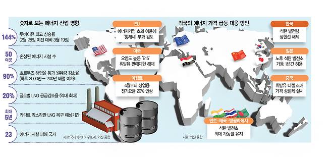 미국·이란 전쟁은 이스라엘이 이란의 사우스파스 가스전을 공격하고 이란이 카타르 라스라판 액화천연가스(LNG) 시설 공격으로 맞대응한 지난달 18일을 정점으로 한도 없는 에너지 전면전에 들어갔다. 한 달 넘게 이어진 전쟁으로 글로벌 에너지난이 극심해지면서 각국은 전기료 인상과 석탄 에너지 회귀 등의 고육책을 내놓고 있다.