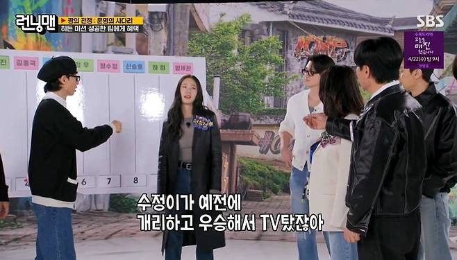 그런 가운데 '런닝맨'에 14년 만에 출연한 정수정을 본 멤버들은 반가워했다. 정수정은 "12년도에 개리 오빠랑 해서 우승했다. 그때 TV를 탔는데, 아직도 쓴다"고 고백했다. 14년 전 '웨딩레이스'편 우승 상품이 아직 방에 있다고. 제작진은 "수정 씨 런닝맨 나왔을 때마다 우승했다고 한다"라며 2회 우승했다고 알려주었고, 멤버들은 "우승하겠네"라고 말했다.