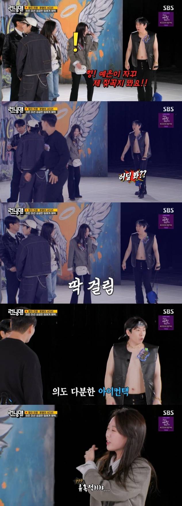 의도 가득한 아이컨택을 들킨 지예은이 민망해하자 '런닝맨' 멤버들은 양세찬을 향해 "너도 유혹하지마"라고 말하면서 웃음을 자아냈다.