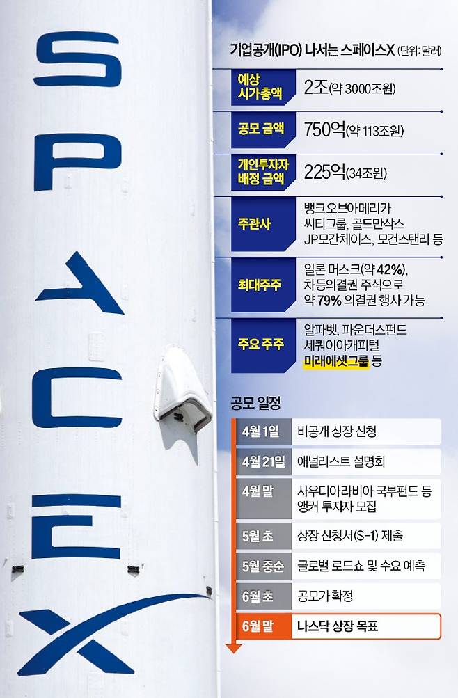 역대 최대 규모로 진행되는 우주항공 기업 스페이스X의 기업공개(IPO)에 국내 기관과 개인이 참여할 수 있게 된다. 미래에셋그룹이 조(兆) 단위 공모주 물량을 확보해 국내 기관과 개인 전문투자자의 신청을 받을 예정이다. 초대형 글로벌 IPO 물량이 국내 투자자에게 풀리는 것은 이번이 처음이다.