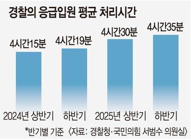 경찰청이 5일 국회 행정안전위원회 소속 서범수 국민의힘 의원에게 제출한 자료에 따르면 응급입원 1건당 경찰의 평균 처리시간은 집계가 처음 시작된 2024년 상반기 4시간15분에서 지난해 하반기 4시간35분으로 20분 늘었다. 반기별 조사결과 이 처리시간은 꾸준히 증가세다. 응급입원 의뢰 건수도 2024년 1만8066건에서 지난해 2만839건으로 15.5% 증가했다.