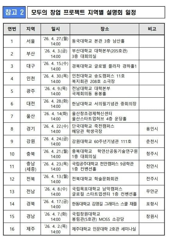 이번 전국 투어 이벤트는 6일(월) 강원대를 시작으로 17일(금)까지 전국 11개 대학에서 진행한다. 이와 별도로 '모두의 창업'의 상세한 사업 내용 안내를 위해 2일부터 약 한 달간 16개 지역별 오프라인 설명회를 진행하고 있고, 일부 지역은 중기부 공식유튜브 채널(www.youtube.com/@bizinfo1357)을 통해 전국에 생중계를 진행할 예정이다.