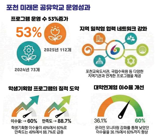 포천 지역은 더 이상 ‘교육 변방’이 아니다. ‘학생의 선택과 도전으로 미래를 열어가는 포천교육’이라는 비전은 현실로 다가온다. 공유학교 참여 학생이 늘어나는 것이 이를 뒷받침하는 확실한 근거다. 포천 미래온 공유학교가 이뤄낸 혁신적 교육 생태계는 인문도시 포천을 지탱하는 가장 강력한 동력이다. 포천교육지원청은 지금도 포천 지역 학생들이 행복한 삶을 살아갈 수 있도록 최고의 교육 환경을 갖추기 위해 고군분투하고 있다.
