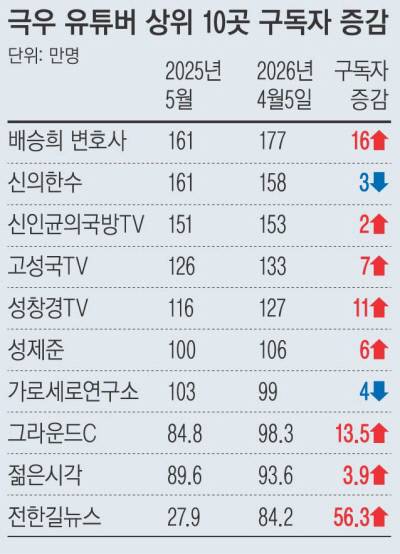 전한길뉴스는 지난해 5월 구독자가 27만9000명에서 이날 84만2000명으로 11개월 만에 3배가 됐다. 배승희변호사(161만명→177만명), 그라운드C(84만8000명→98만3000명), 고성국TV(126만명→133만명) 등도 구독자가 늘었다. 구독자가 감소한 곳은 신의한수(161만명→158만명), 가로세로연구소(103만명→99만명) 등이다.