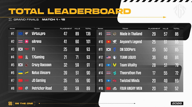 버투스 프로는 3일부터 5일까지 사흘간 진행한 ‘펍지 글로벌 시리즈(PGS)’ 서킷1 그랜드 파이널(매치1~15)에서 총 136점을 획득하며 정상에 섰다.