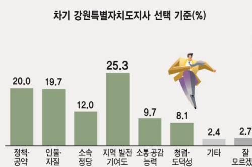 이번 조사에서 '차기 강원특별자치도지사를 선택하는 기준은 무엇인가'라고 질문한 결과 '지역 발전 기여도'가 25.3%로 가장 큰 응답률을 기록했다. '정책과 공약(20.0%)'과 '후보자의 인물 및 자질(19.7%)'은 '지역 발전 기여도'와 오차범위 내 응답률을 보이며 상위권에 올랐다.