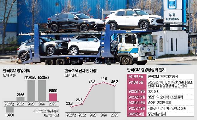 더 중요한 것은 신차 배정이었다. 당시 정부와 산은 안팎에서는 ‘돈을 넣는 것보다 중요한 건 한국 공장에서 무엇을 만들게 하느냐’는 인식이 강했다. 실제 정상화 방안의 실질적 성패는 이후 배정된 신차 2종이 갈랐다. 트레일블레이저와 트랙스크로스오버가 인천 부평과 경남 창원 공장에서 본격 생산되면서 한국GM의 체질이 바뀌기 시작했다. 군산공장 폐쇄 이후 차종을 줄이고 생산을 집중한 전략은 북미 시장에서 먹혀들었다. 한국GM의 지난해 완성차 판매량은 46만2000대다. 이 가운데 96.8%(44만7000대)가 해외에서 판매됐다.