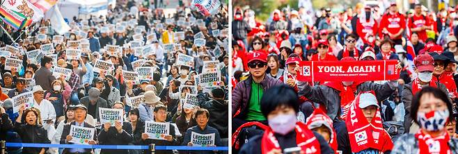 | “내란 청산” 윤석열 전 대통령이 탄핵당한 지 1년이 된 4일 헌법재판소 인근인 서울 종로구 안국역 앞에서 ‘내란 청산’ 집회가 열려 참석자들이 ‘내란외환 청산하자’ 등이 적힌 손팻말을 들고 “내란범 끝장” 등 구호를 외치고 있다(왼쪽사진). “尹 어게인” 4일 서울 종로구 안국역 인근에서 윤석열 전 대통령 지지자들이 “윤 (전 대통령) 어게인” 등 구호를 외치고 있다.(오른쪽사진) 이 집회는 진보 단체의 ‘내란 청산’ 집회와는 약 300m 떨어진 곳에서 열려 양쪽 간 충돌은 일어나지 않았다. 뉴시스 |