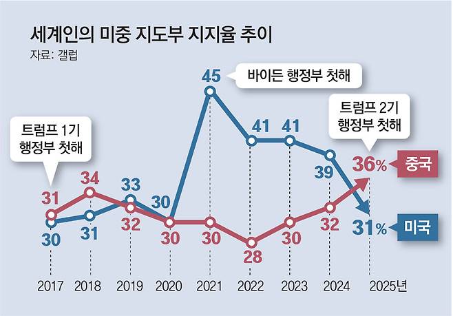 중국이 미국보다 높은 지지율을 보인 건 이번이 처음은 아니다. 조지 W 부시 행정부 시절이던 2008년 글로벌 금융위기와 이라크전쟁 등의 여파로 중국이 미국보다 3%포인트 앞섰다. 트럼프 행정부 1기 시절이던 2017년(1%포인트), 2018년(3%포인트)에도 중국이 미국보다 우위에 섰다. 다만 이번 조사에선 중국이 미국을 앞지른 사례 가운데 두 나라의 격차가 5%포인트로 역대 가장 크게 벌어졌다.