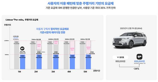 링카는 적게 타는 고객에게는 그만큼 차량 가치를 보존해준 것에 대한 '혜택'을 부여해 이용료를 낮춰준다. 미래에 차량을 매각할 때 발생하는 기대수익을 역산해 현재의 이용료에 반영하는 원리다. 최 대표는 "퍼마일 요금제를 이용하면 기존 방식보다 월 요금을 최대 35%까지 절감할 수 있는 효과가 있다"며 "현재 정확한 요금 모델 확립을 위해 데이터를 수집·검증하는 단계로 올해 하반기 중 신규 고객들에게 실제 도입될 예정"이라고 말했다.