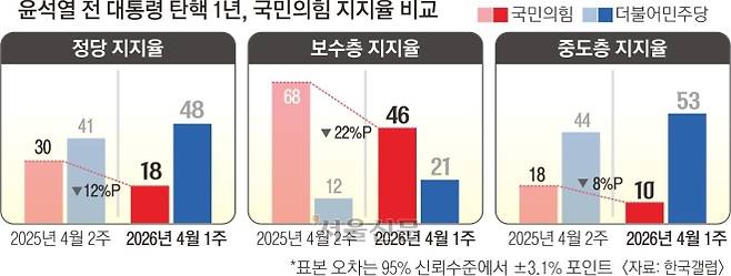 윤석열 전 대통령 파면 이후 지난 1년 동안 국민의힘은 중도층과 보수층 모두에게 소구력을 잃은 것으로 나타났다. 6·3 지방선거를 두 달도 채 남겨두지 않은 가운데 정당 지지율은 더불어민주당과 30%포인트 차까지 벌어졌고 ‘텃밭’ 대구까지 위협받는 상황이지만 활로를 찾지 못하는 모습이다.