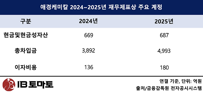 문제는 이러한 대규모 투자를 뒷받침할 현금창출력이 현저히 떨어져 있다는 점이다. 지난해 말 기준 애경케미칼의 현금및현금성자산은 687억원에 불과하다. 반면 무역금융과 어음, 시설대 등으로 구성된 총 차입금 규모는 4993억원에 달한다. 보유한 현금보다 갚아야 할 빚이 7배 이상 많은 상태다.