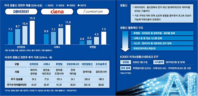 그러나 이들 국내 테마주의 실적은 난감하다. 대한광통신과 오이솔루션 모두 2025년 적자를 냈다. 올해 소폭 흑자가 나지만 PER 기준으로는 100배가 훌쩍 넘는다. 여의도 증권가에선 고평가 부담으로 국내 광통신 관련주로는 ETF를 짜기 어려울 정도라고 말한다.
