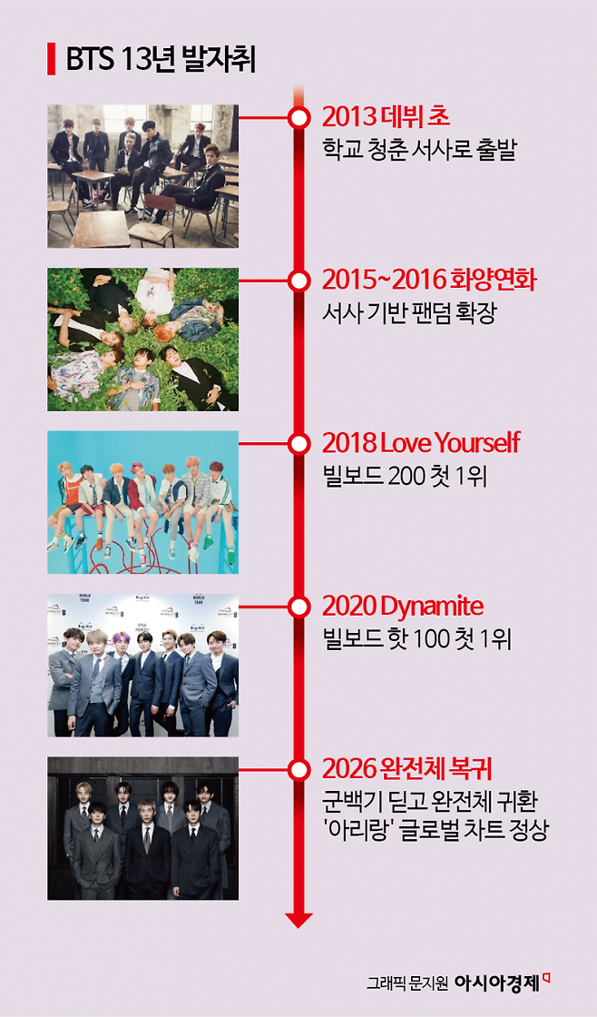멤버들은 솔로 활동을 통해 각자의 음악적 색을 확장했고, 지난해 6월 전원이 병역 의무를 마친 뒤 올해 3월 완전체로 복귀했다. 새 앨범 아리랑과 타이틀곡 '스윔(SWIM)'은 각각 영국 오피셜 앨범 차트와 싱글 차트 1위를 기록했다. 서울 광화문광장에서 열린 컴백 쇼의 넷플릭스 생중계는 전 세계 1840만 명이 시청했다.