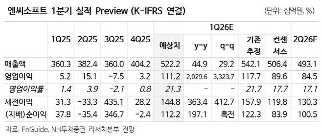 안 연구원은 “아이온2의 매출이 3개월 온전히 반영되고, 2월 출시한 리니지클래식 매출도 크게 기여할 것”이라며 “아이온2는 2월 9일까지 매출액 682억원을 기록했다고 발표한 바 있으며, 1분기는 1317억원을 전망한다”고 설명했다.