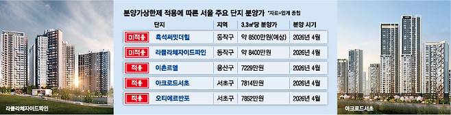 반면 분상제 비대상인 동작구 노량진과 흑석동 분양가는 강남3구와 용산을 추월하는 양상이다. 특히 흑석11구역 재개발 사업인 흑석써밋더힐은 3.3㎡당 분양가가 8500만원으로 예상된다. 조합의 분양가 산정안에 따르면 전용 59㎡ 분양가는 타입별 최고가 기준 21억원대 후반, 전용 84㎡는 28억3000만원 수준에 이를 전망이다. 반포와 인접한 입지적 특성과 인근 단지 같은 평형 매물 시세가 30억원대에 형성된 결과로 풀이된다.