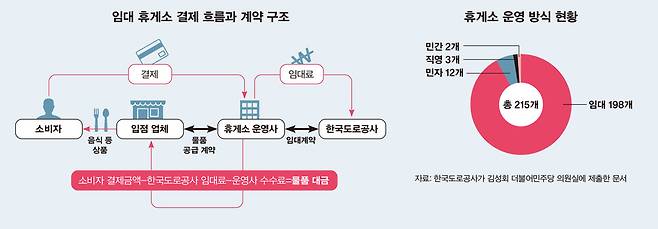 왜 이런 문제가 발생했을까. 이유를 알기 위해선 먼저 고속도로휴게소의 운영 구조를 파악해야 한다. 도로공사가 관할하는 전국의 고속도로휴게소는 215곳이다. 여기서 12곳은 민자로 지었고, 민간 휴게소는 2곳, 도로공사 소유의 휴게소는 201곳이다. 도로공사는 201곳 가운데 3곳만 직영으로 운영하고, 나머지 198곳은 경쟁입찰을 통해 민간 운영사에 운영을 위탁한다. 그런데 도로공사는 운영사와 임대계약을 할 때 “영업권을 제3자에게 재임대할 수 없다”는 조항을 계약서에 넣고 있다. 이 때문에 운영사는 휴게소 입점 업체와 ‘물품 공급 계약’을 맺는다. 그러니까 실제 물품 판매는 입점 업체가 하지만 소비자가 낸 돈은 운영사에 입금된다. 운영사는 이 물품 판매 대금 가운데 일부를 수수료로 떼고, 일부는 도로공사에 임대료로 낸 뒤 남은 금액을 입점 업체에 지급한다. 문제는 운영사가 이 물품 대금을 입점 업체에 제대로 지급하지 않고 버텨도 도로공사가 이런 문제를 제대로 감시·감독을 하지 않고 방치한다는 점이다. 이런 상황에서 운영사가 도로공사 전관들을 통해 로비하고 유착 관계를 맺고 있다는 의혹까지 제기된다.
