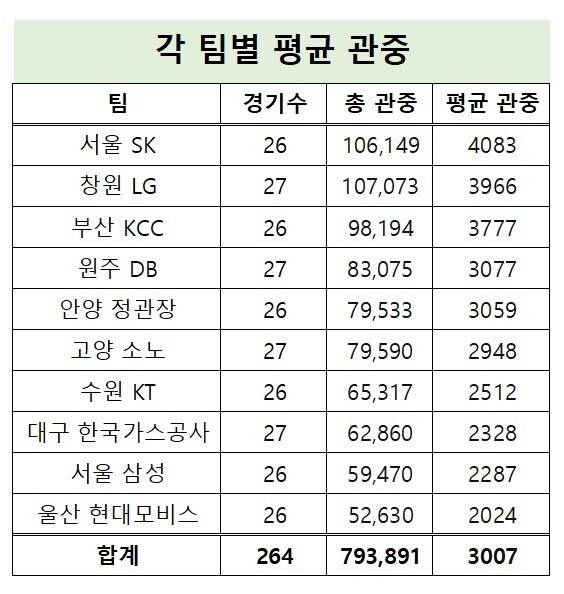 평균 관중은 SK가 4,083명으로 유일하게 4000명을 넘었고, 그 뒤는 LG, KCC, DB, 정관장, 소노가 잇는다.