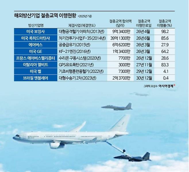 이달까지 절충교역을 마쳐야 하는 방산기업도 있다. 보잉은 대형공격헬기 AH-64E 36대를 납품하면서 9억 3400만 달러(1조 4104억원)를 절충교역으로 합의했다. 이달까지 절충교역을 마쳐야 하지만 이행률은 98%다.