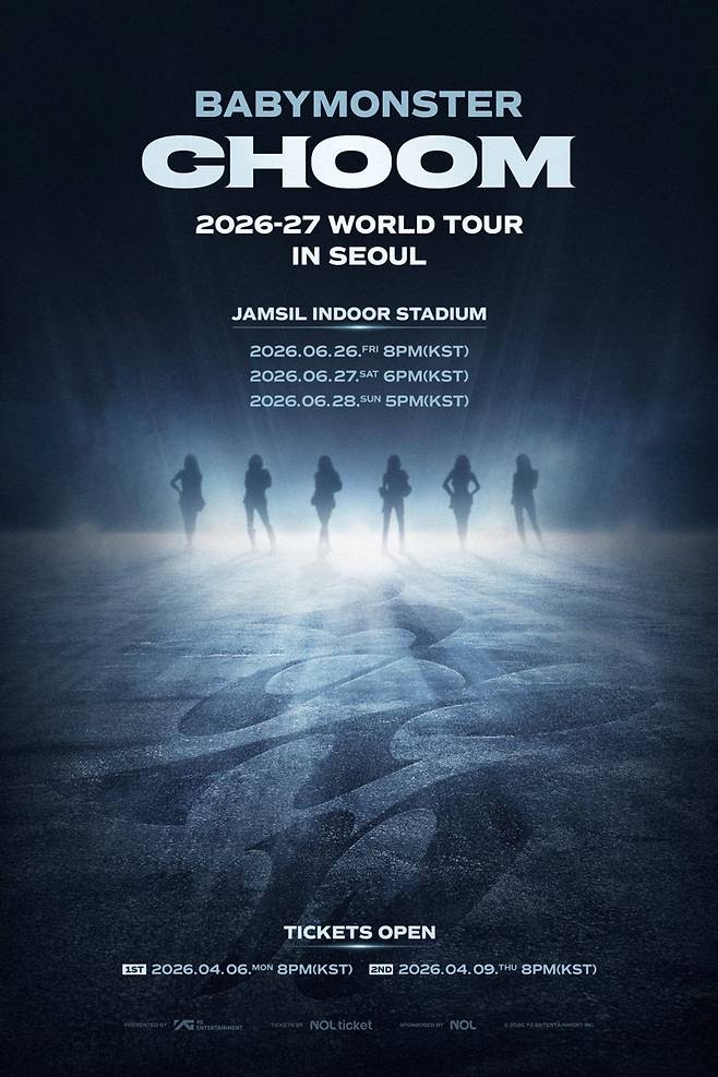 베이비몬스터는 오는 6월 26일부터 28일까지 사흘간 서울 잠실실내체육관에서 '2026-27 BABYMONSTER WORLD TOUR [춤 (CHOOM)] IN SEOUL'을 개최한다.