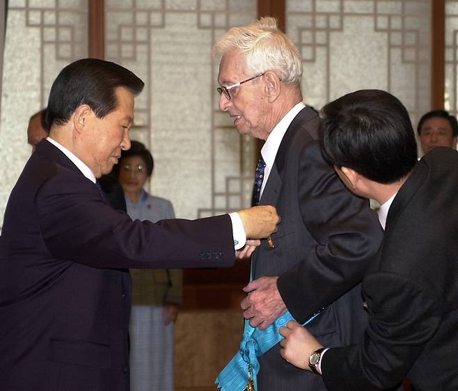 | ▲ 김대중 대통령이 청와대에서 국내 산림자원 보호와 육성에 평생을 바친 미국 출신의 귀화인 민병갈(閔丙葛.미국 이름 칼 페리스 밀러)씨에게 금탑산업훈장을 수여했다. 2002.3.11 |