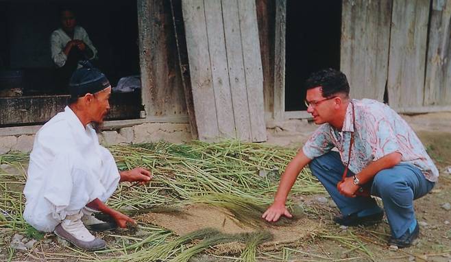| ▲ 촌로와 대화 나누는 민병갈 민병갈은 젊은 시절부터 틈나는 대로 시골을 찾아 촌로들과 대화 나누기를 즐겼다. |
