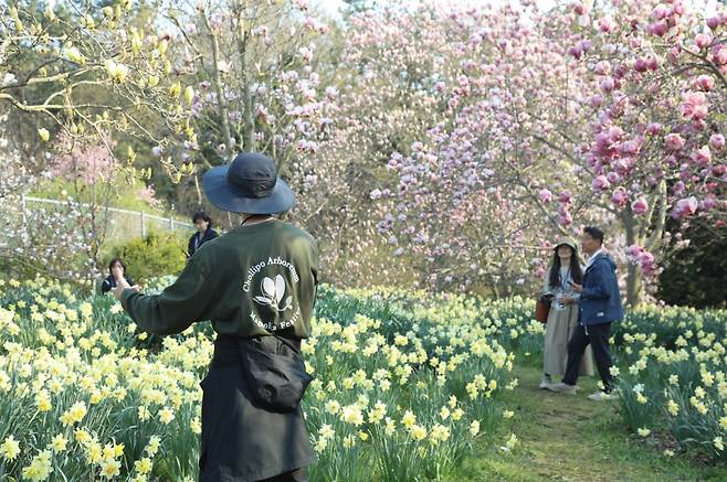 | ▲ 천리포수목원 목련축제 2024년 5월 천리포수목원 목련축제를 찾은 탐방객들이 목련꽃 아래에서 기념사진을 찍고 있다. |