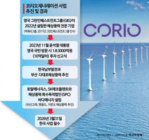 맥쿼리자산운용의 해상풍력 계열사인 영국 코리오제너레이션이 한국 해상풍력 사업에서 완전히 철수한다. 2023년 윤석열 전 대통령의 영국 국빈 방문을 계기로 1조3000억원 규모의 투자 계획을 발표하며 주목받았으나, 글로벌 업황 악화와 수익성 저하를 이기지 못하고 전격적인 조직 해체와 사업권 매각 수순에 들어갔다.