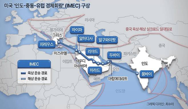 그 교차점에 있는 것이 바로 미국이 주도하는 인도-중동-유럽 경제회랑(IMEC)이다.