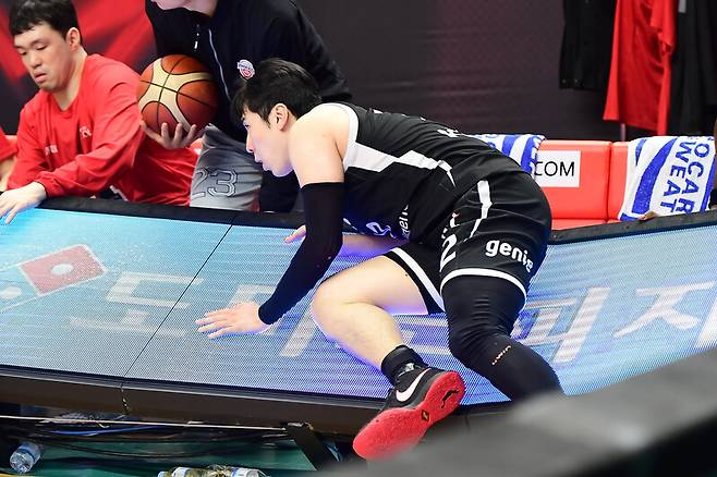 3쿼터 다시 위기를 맞은 KT지만, 이후 문정현이 공을 향해 몸을 날렸다. A보드에 강하게 충돌했지만, 문정현은 코트를 끝까지 지켰다.