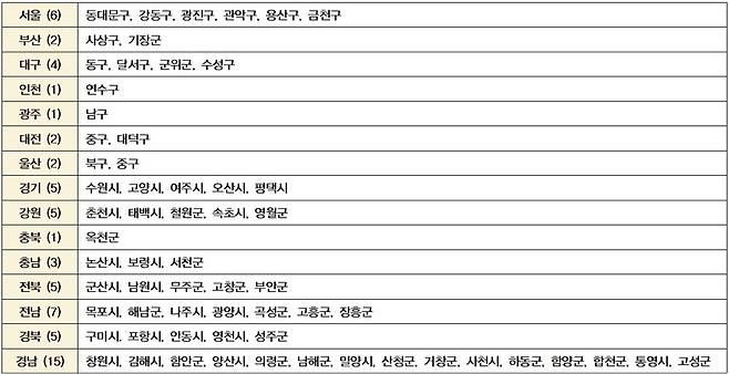 2026년 읍면동 스마트 복지·안전서비스 개선 지원 공모사업에 선정된 15개 시도 64개 시군구는 다음과 같다.