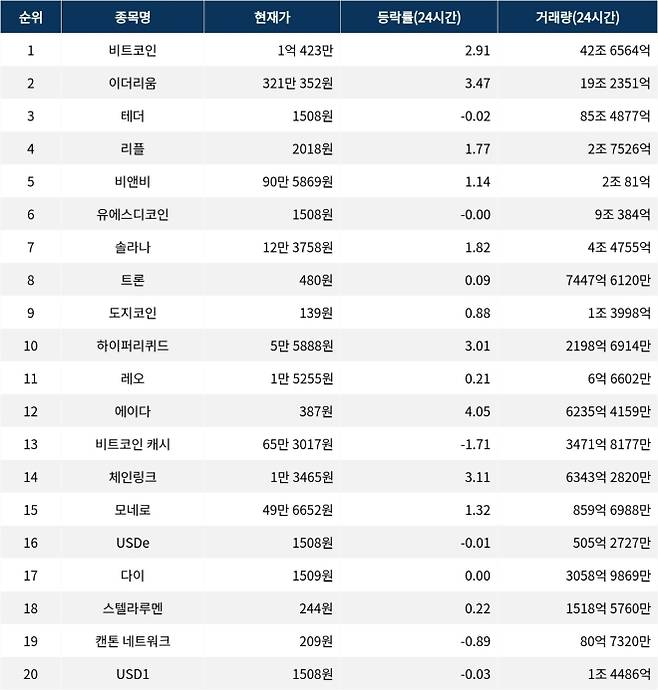 한편 솔라나는 12만 3758원에 거래되며 1.82% 상승했다. 시가총액은 70조 9098억 원이다. 같은 시각 트론은 480원에 거래되며 0.09% 상승했다. 거래량은 7447억 6120만 원이다. 도지코인은 139원에 거래되며 0.88% 상승했다. 시가총액은 21조 3888억 원이다.
