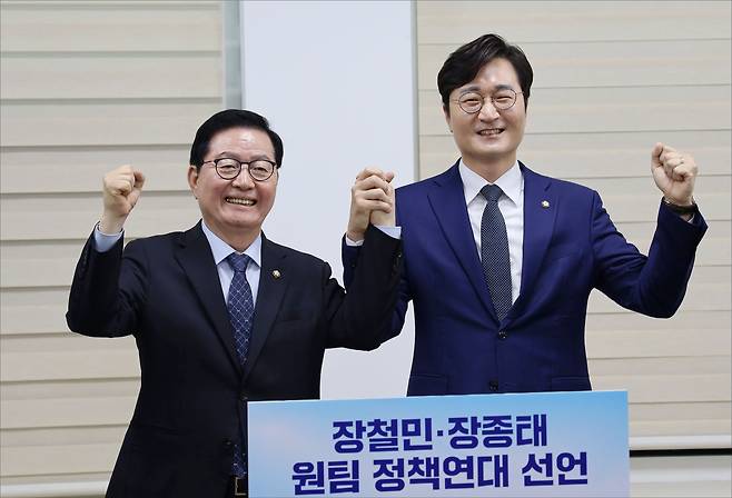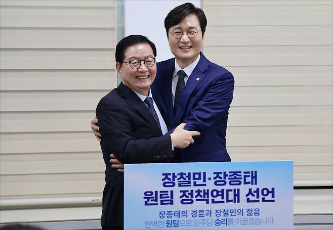 이날 장종태 의원은 "장철민 후보의 승리를 위해 모든 힘을 보탤 것"이라며 "저희 두 사람은 이번 대전시장 경선 결선에서 충청권 행정통합이라는 이재명 정부의 과제를 완수하고, 대전의 미래를 만들기 위해 '원팀'으로 나설 것을 선언한다"고 밝혔다.