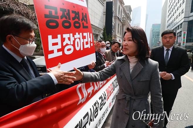 | ▲ 6·3지방선거 국민의힘 대구시장 후보 공천에서 공천 배제(컷오프)된 이진숙 전 방송통신위원장이 24일 오전 서울 여의도 국민의힘 당사 1층에서 기자회견을 하기 위해 도착하며 지지자들과 인사하고 있다. |