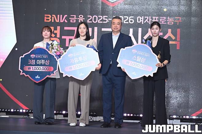 WKBL(한국여자농구연맹)은 6일 서울시 용산구 서울드래곤시티호텔 그랜드볼룸 한라홀에서 BNK금융 2025~2026 여자프로농구 정규리그 시상식을 개최했고, 통계 부문 시상으로 행사가 시작됐다.