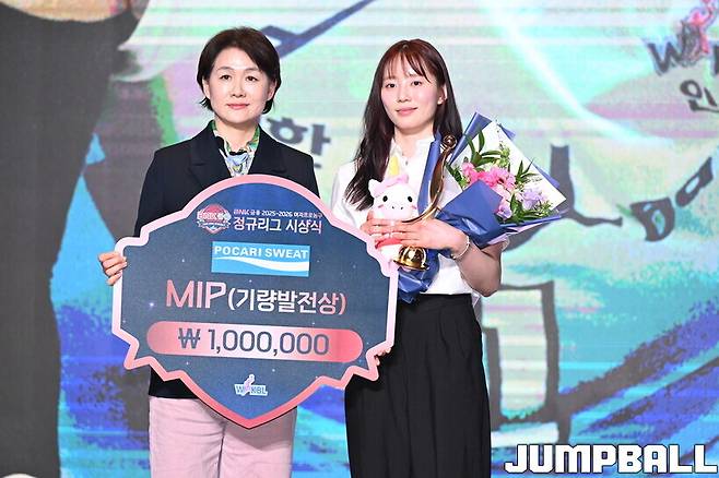 아 자리에서 포카리스웨트 MIP에 선정되는 영광을 누린 자는 신이슬이다. 신이슬은 신한은행 두번째 시즌인 올 시즌에서 전 경기(30경기)에 출전, 평균 34분 21초 동안 12.7점 5.1리바운드 2.6어시스트로 활약했다.