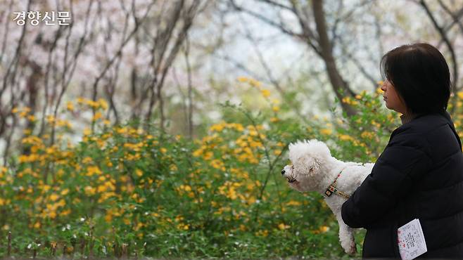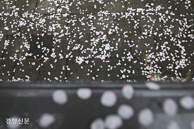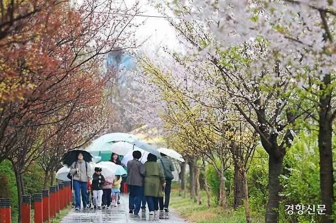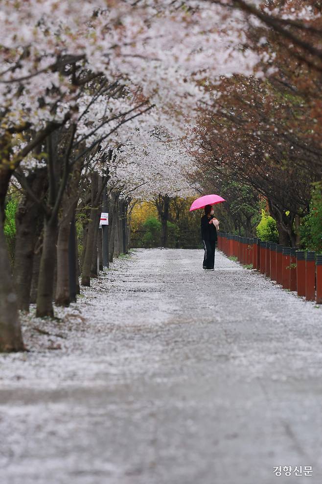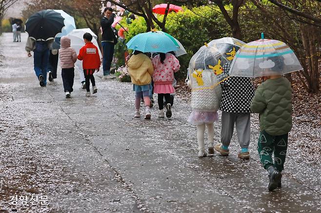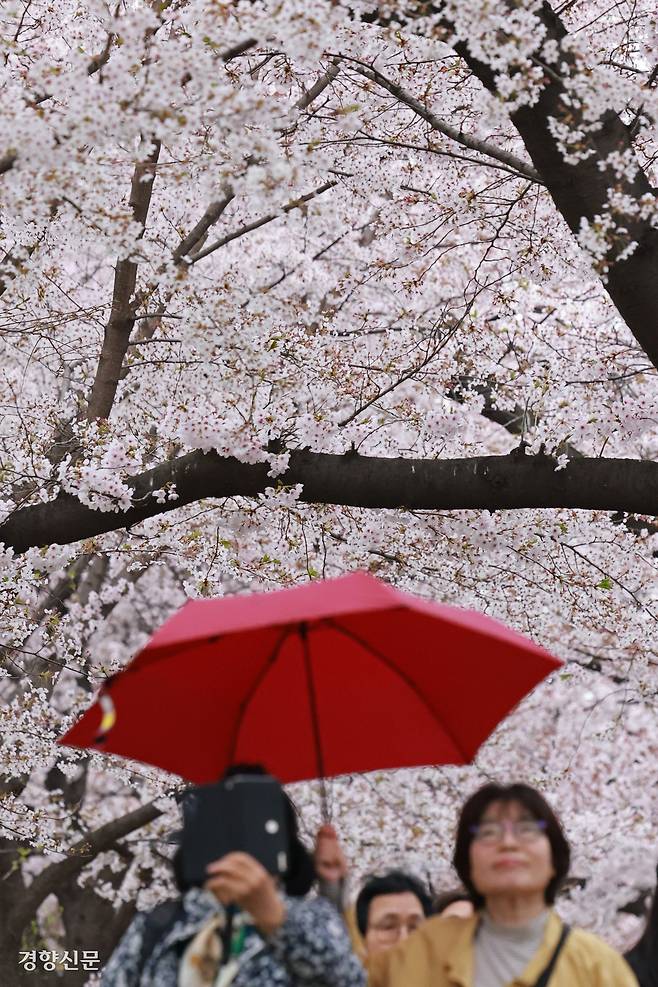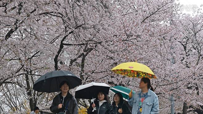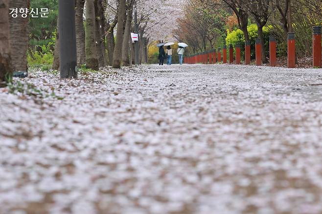 여의도 봄꽃축제가 열리고 있는 서울 여의도 윤중로를 찾은 시민들은 우산을 쓰고 막바지 벚꽃 나들이를 즐겼다. 바람에 떨어진 벚꽃잎이 바닥을 메웠다. 기상청은 비가 그친 뒤 찬 공기가 내려와 다음날인 7일 아침 기온이 크게 떨어질 것으로 예측했다. 오는 목요일부터 금요일 사이에는 다시 전국에 봄비가 내릴 전망이다.