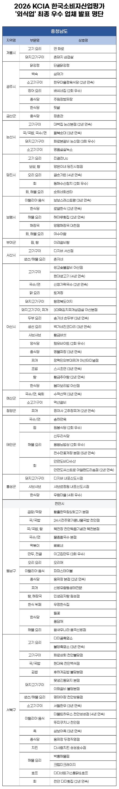 KCA한국소비자평가는 대한소비자협의회가 주최하고 한국소비자평가가 주관하는 <2026 KCIA 한국소비자산업평가 ‘외식업’> 충남 지역 평가 결과를 발표했다.