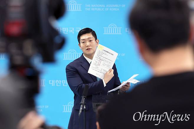 | ▲ 3월 31일 김재섭 국민의힘 의원이 서울 여의도 국회 소통관에서 기자회견을 열고 정원오 더불어민주당 서울시장 예비후보의 해명을 요구하고 있다. 김 의원은 "정 후보가 성동구청장 재직 당시 '2023년 국제참여민주주의 포럼 및 글로벌 문화 페스티벌 참석'이라고 출장 목적을 기재한 멕시코 출장에 동행한 청년정책전문관은 여성인데 공무국외출장 심사 의결서에는 성별을 '남성'으로 표기해 놓고 의원실에 제출한 성동구청 자료에는 성별 항목을 가려서 제출했다"고 했다. 김 의원은 "여성 직원과 해외 출장을 다녀왔다는 사실을 감추고 싶었던 게 아니라면 또는 공문서를 허위 조작한 게 아니라면 굳이 성별만 딱 가리고 줄 이유가 무엇인가"라며 의혹을 제기했다. |