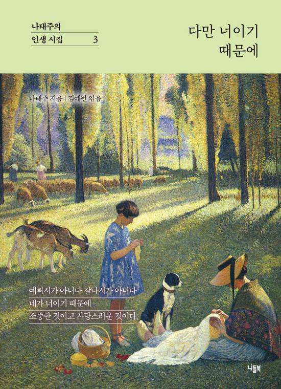 나태주 시인의 인생 시집 프로젝트 마지막 권인 '다만 너이기 때문에'는 '나를 사랑하는 것'(1권)과 '나를 찾아가는 과정'(2권)을 지나, '가장 나답게 빛나라'(3권)는 메시지로 여정을 마무리한다.