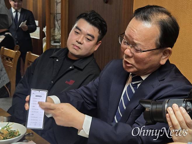 | ▲ 더불어민주당 소속으로 대구시장에 출마하는 김부겸 전 국무총리가 6일 대구 중구의 한 식당에서 자신의 휴대전화를 들어 시민들이 보내온 문자메시지를 보여주고 있다. |