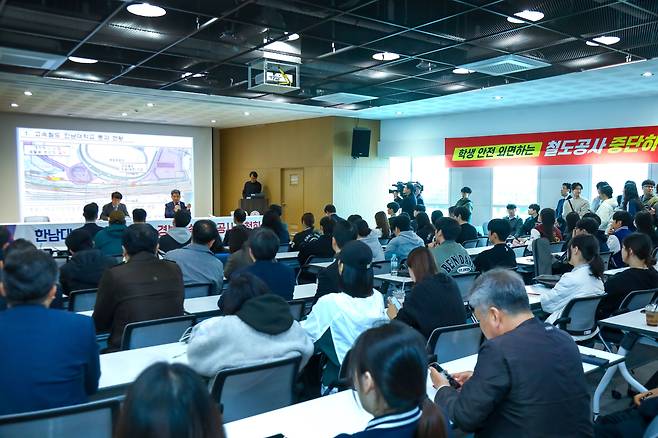 | ▲ 국가철도공단이 한남대학교 캠퍼스 일부를 관통하는 경부고속철도 대전북연결선 선형개량사업을 추진하면서 대학 측과 학생 등이 반발하고 있다. 사진은 6일 오후 한남대 캠퍼스혁신파크 1층 미디어룸에서 열린 '경부고속철 대전북연결성 공사 강행 반대 공청회'. |
