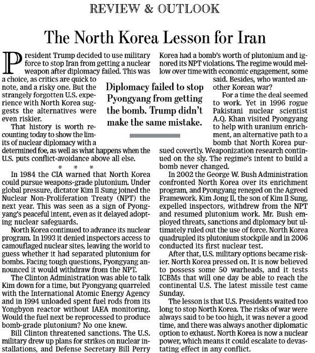WSJ는 3일자 사설 '이란을 위한 북한의 교훈(The North Korea Lesson for Iran)'에서 미국이 북한 핵개발을 막지 못한 핵심 이유가 외교에 집착하며 군사적 선택을 끝내 포기했기 때문이라고 했다.