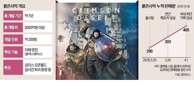 커뮤니티에서도 “해볼만 한 게임이다” “재밌다” 등의 평이 흘러나오기 시작했고, 붉은사막은 출시 12일 만에 글로벌 온·오프라인 합산 판매량 400만 장을 돌파했다. 국내 게임사가 개발한 싱글 패키지 타이틀 기준 최단 기록이다. 매출로 환산하면 약 3000억원 규모로, 지난해 펄어비스 연간 매출(3656억원)의 8할에 달한다.